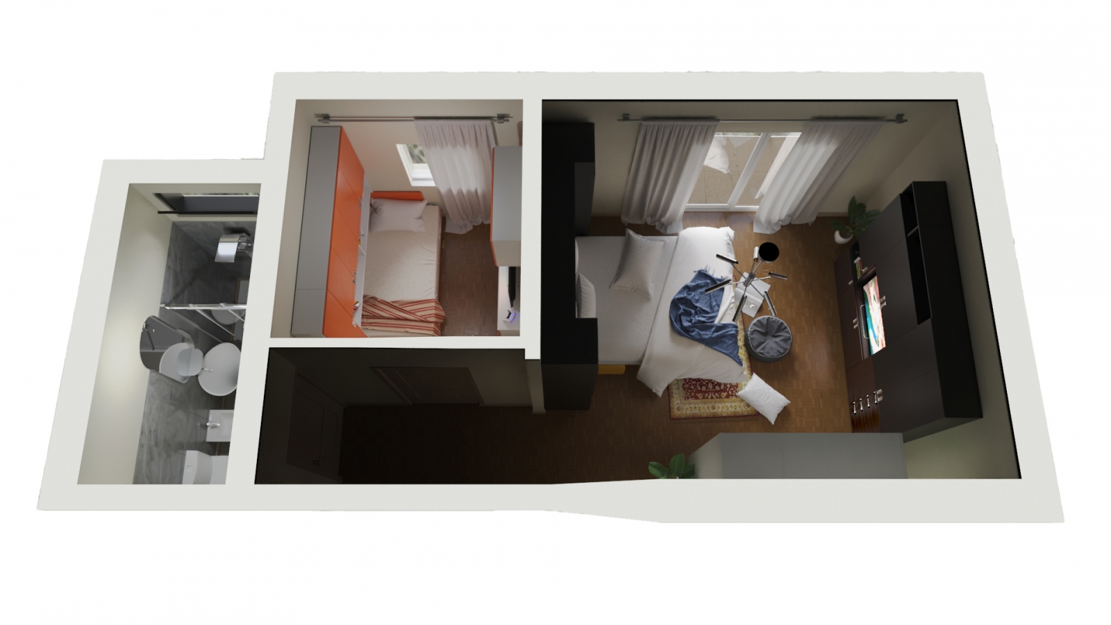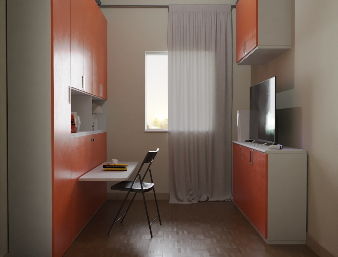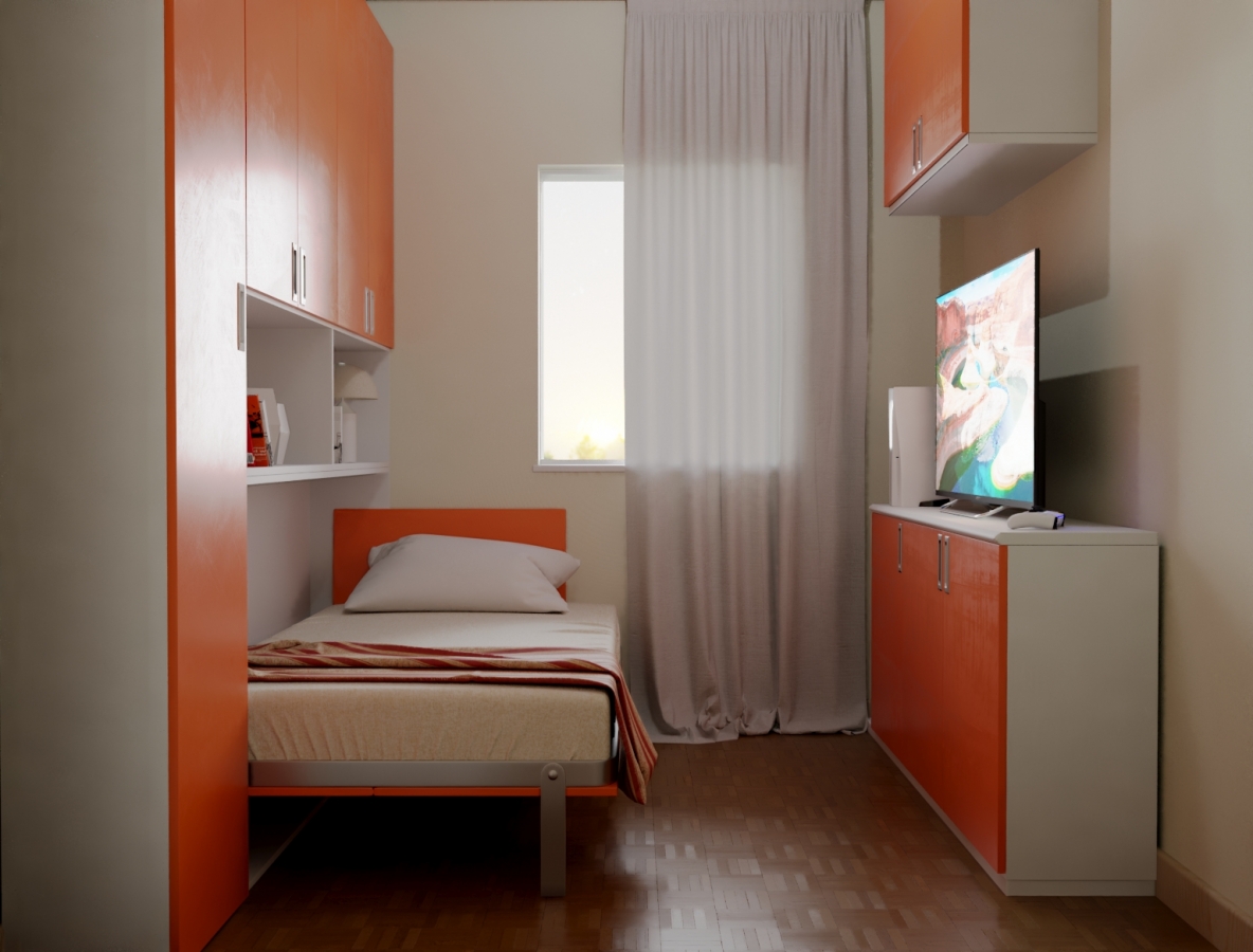 Camera singola di piccole dimensioni ma molto bene arredata grazie ai nostri mobili salvaspazio. Essa dispone di una finestra molto luminosa sulla parete di fondo. La parete di sinistra è stata arredata con una parete attrezzata composta da armadiature, librerie e un comodissimo mobile letto a scomparsa 1 piazza con scrivania abbattibile. Sulla parete di fronte una madia tre ante, un mobile pensile con la possibilità di inserire nella parte centrale un televisore anche di formato grande.