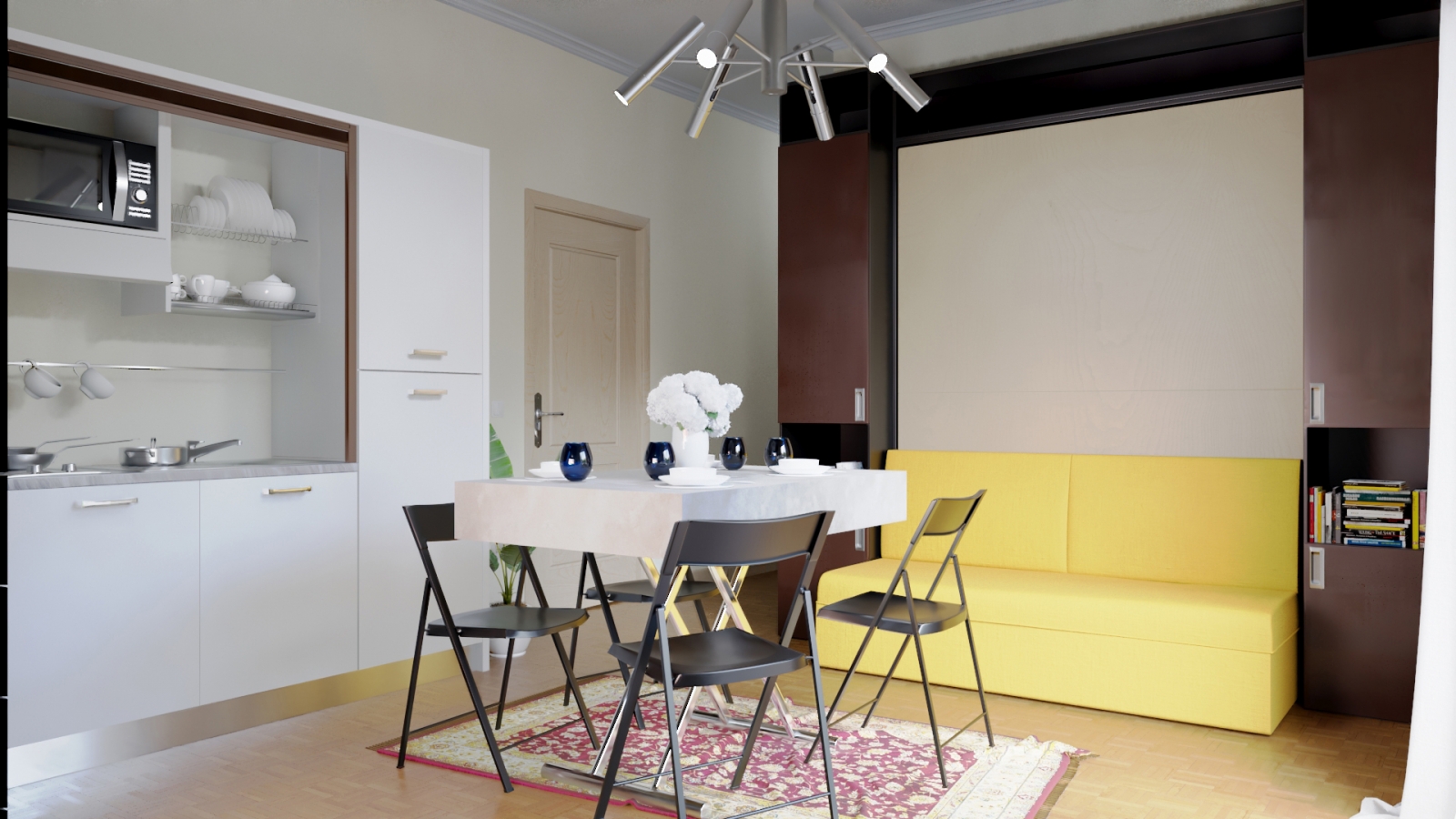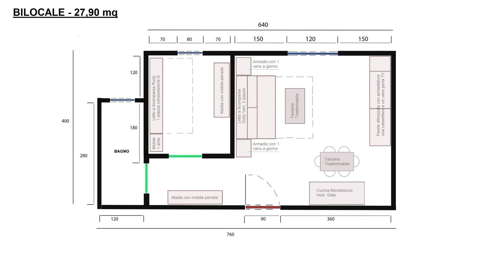 Mini appartamento bilocale di 27,9 mq composto da un salone con angolo cottura, una cameretta e un grande bagno. Grazie ai nostri mobili trasformabili salvaspazio siamo riusciti ad arredare tutti gli spazi a nostra disposizione rendendoli luminosi, spaziosi e confortevoli dove poter far vivere una famiglia di tre persone senza dover rinunciare a nulla. Il salone con i suoi 18 mq ci ha consentito di realizzare comodi spazi dove svolgere tutte le attività diurne e quando è sera andare a dormire in un comodissimo letto matrimoniale. Nella cameretta anche se di piccole dimensioni, soltanto 6,6 mq siamo riusciti a realizzare una parete attrezzata con armadiature e libreria con un comodissimo letto a scomparsa 1 piazza con scrivania abbattibile.