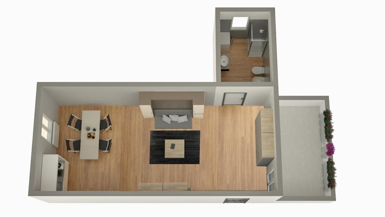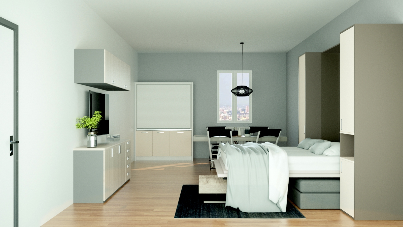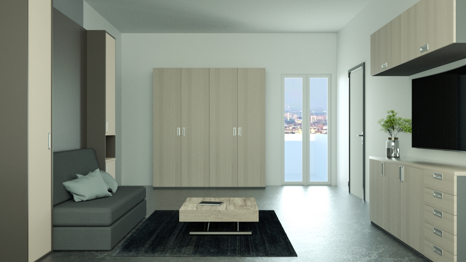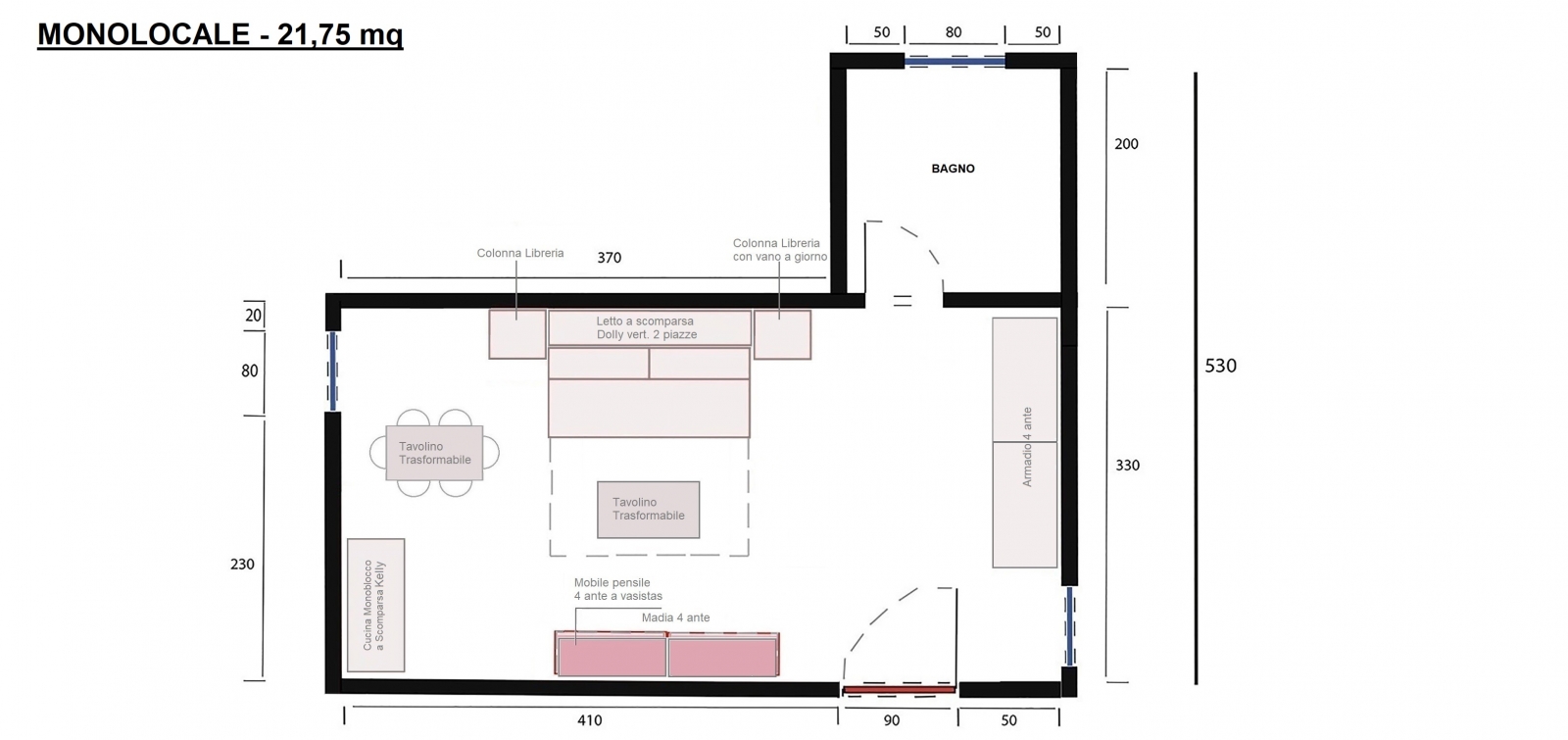 Monolocale openspace di forma rettangolare di 18,15 mq e un bagno di 3,6 mq per una superfice complessiva di 21,75 mq. Il salone è ben illuminato da una finestra situata vicino la porta d’entrata e un’altra posizionata nella parete opposta nella zona dove c’è l’angolo cottura. Questo appartamento è stato arredato con un mobile letto a scomparsa di due piazze con divano, due colonne libreria, un armadio a quattro ante, una madia con sopra un mobile pensile nella zona giorno e un angolo cottura.