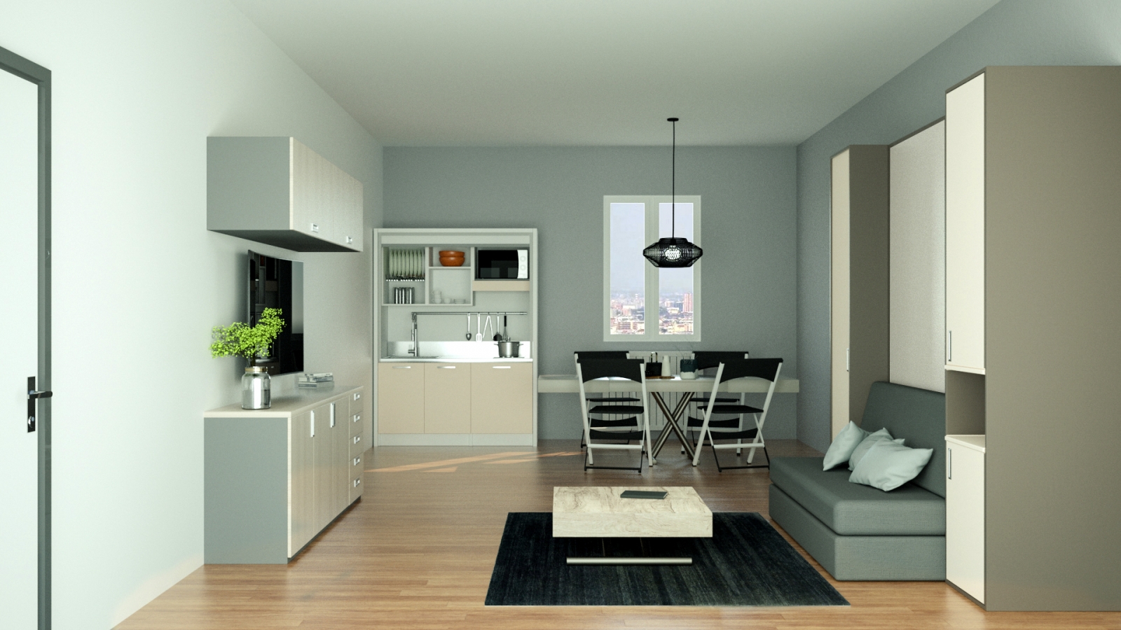 Davanti al divano c’è un tavolino trasformabile salvaspazio di dimensioni L 115 x P 75 x H 27 cm, il quale è facilmente trasformabile da tavolino da salotto in un comodissimo tavolo da pranzo per 8 persone. Questo tavolo come tanti altri modelli della stessa tipologia sono dei veri salvaspazio, normalmente sono posizionati davanti al divano, vengono trasformati in tavolo da pranzo soltanto quando si mangia e poi richiuso e riposizionato davanti al divano. Questo tipo di operazione viene facilitata da speciali meccanismi e da 4 ruote a scomparsa. La sera quando si va a dormire esso rimane posizionato davanti il divano, sotto il letto.