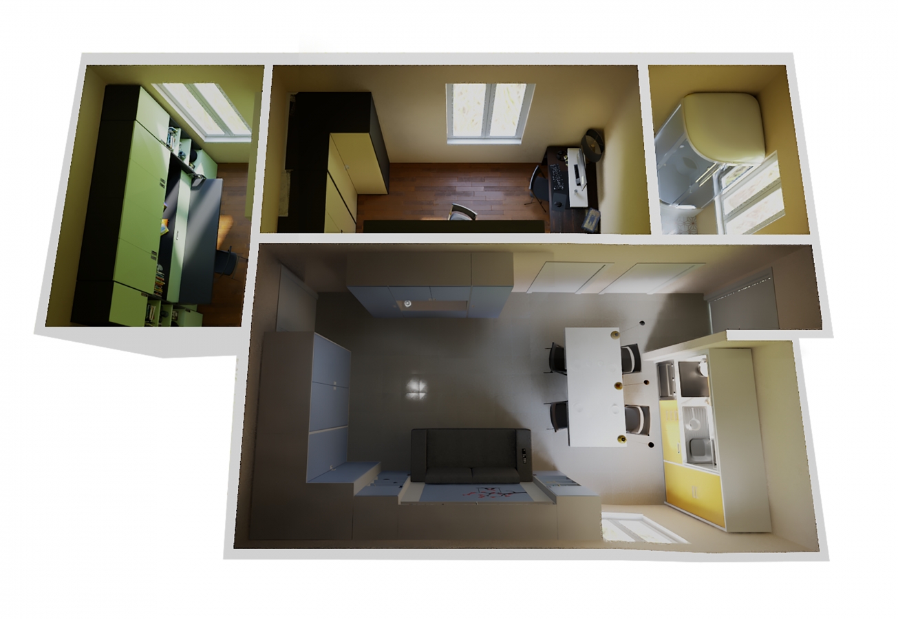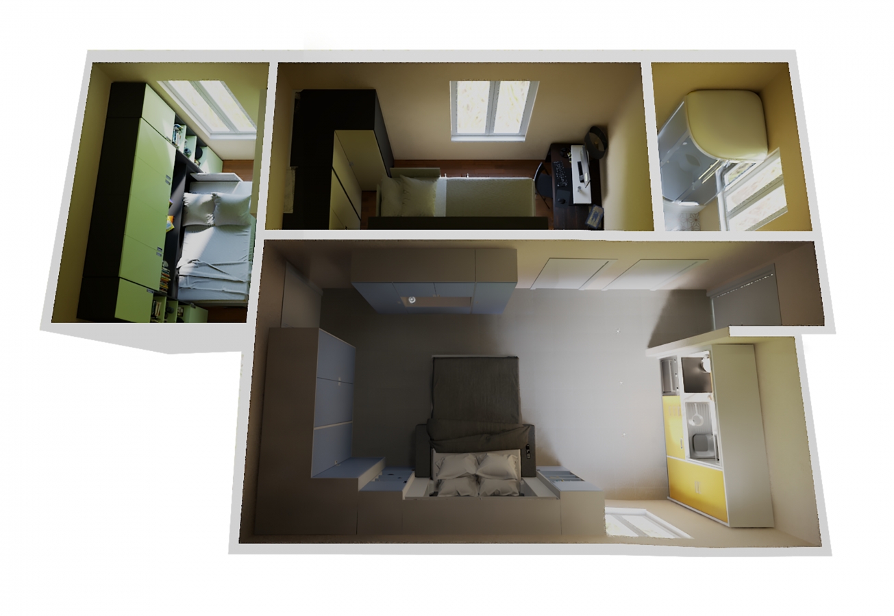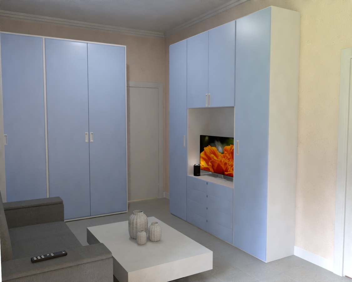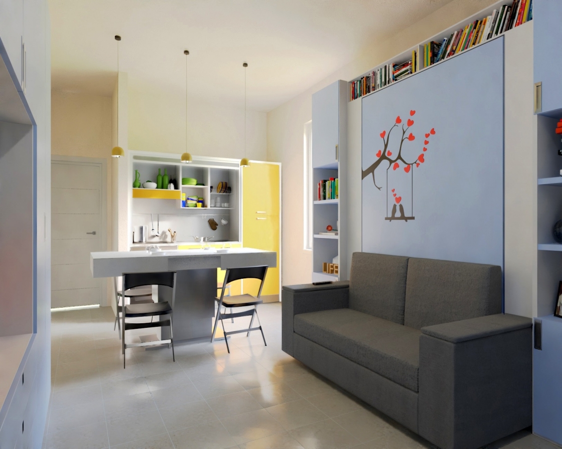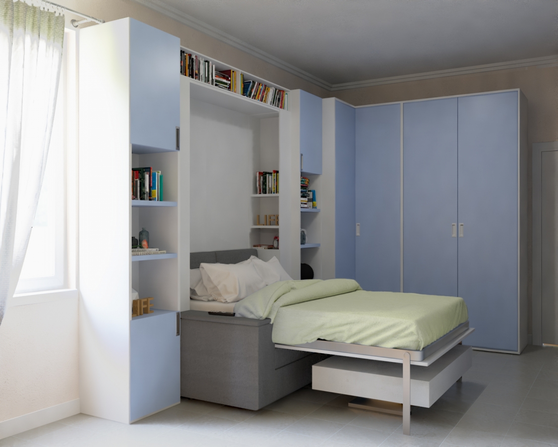 Appartamento trilocale di 44,52 mq formato da un salone polifunzionale di 20 mq con mobile letto a scomparsa matrimoniale e angolo cottura, una camera da letto di circa 10 mq con mobile letto a scomparsa a castello con una grande scrivania per 2 persone, una seconda camera da letto di circa 7 mq per 1 persona con un mobile letto a scomparsa con scrivania, un bagno. Esso è stato arredato con i nostri mobili trasformabili salvaspazio e più precisamente con: mobili letto a scomparsa con divano contenitore e mobili letto a scomparsa con scrivania - cucina monoblocco a scomparsa, tavolino trasformabile da tavolo da pranzo in tavolino da salotto, ecc. I nostri mobili salvaspazio rappresentano la soluzione ideale per arredare tutti gli ambienti con piccoli spazi: cucina, soggiorno e camere da letto. Gli arredi salvaspazio hanno la funzione di ottimizzare lo spazio a disposizione, infatti un mobile anche se di piccole dimensioni può nascondere anche due o tre funzioni diverse tra loro.