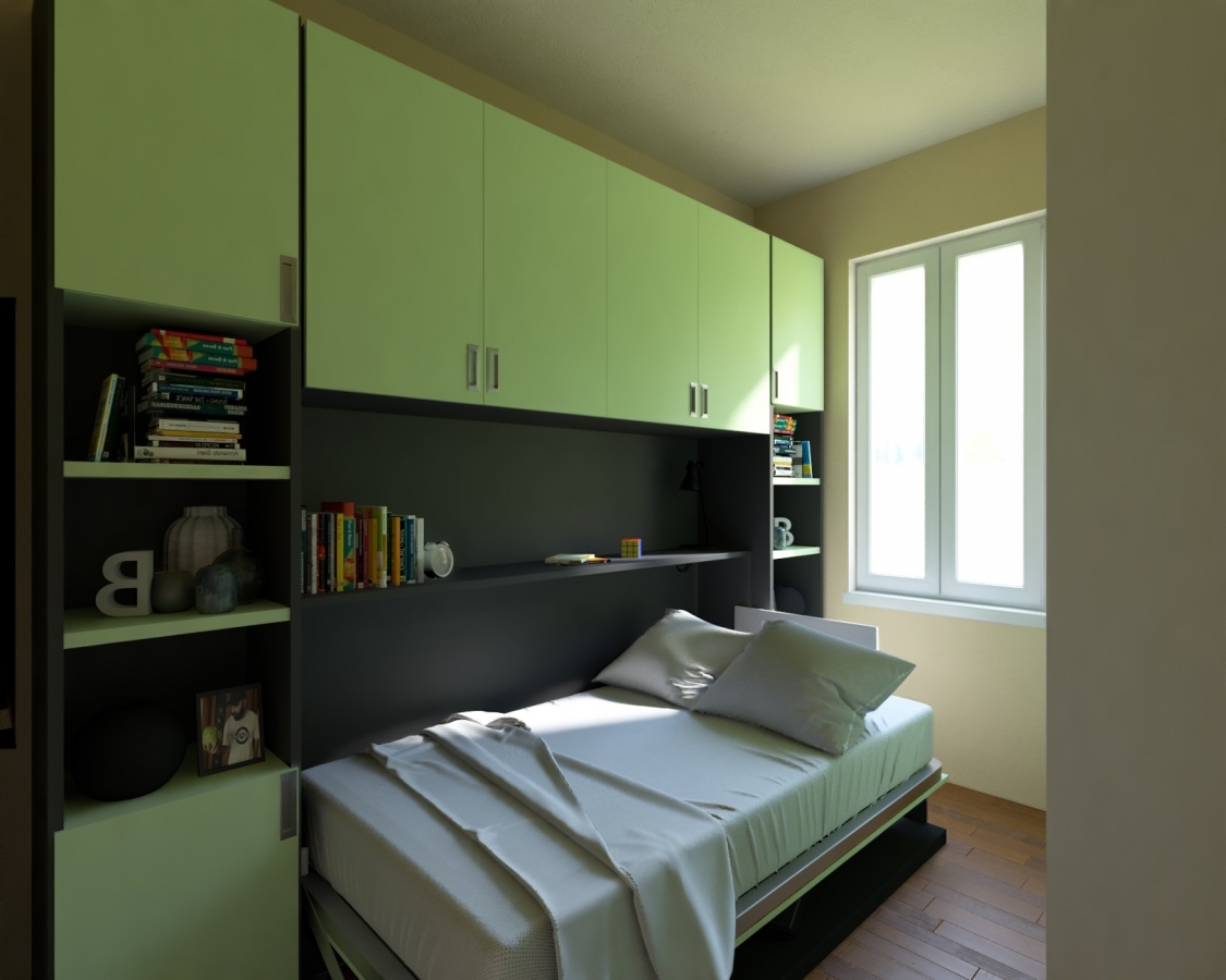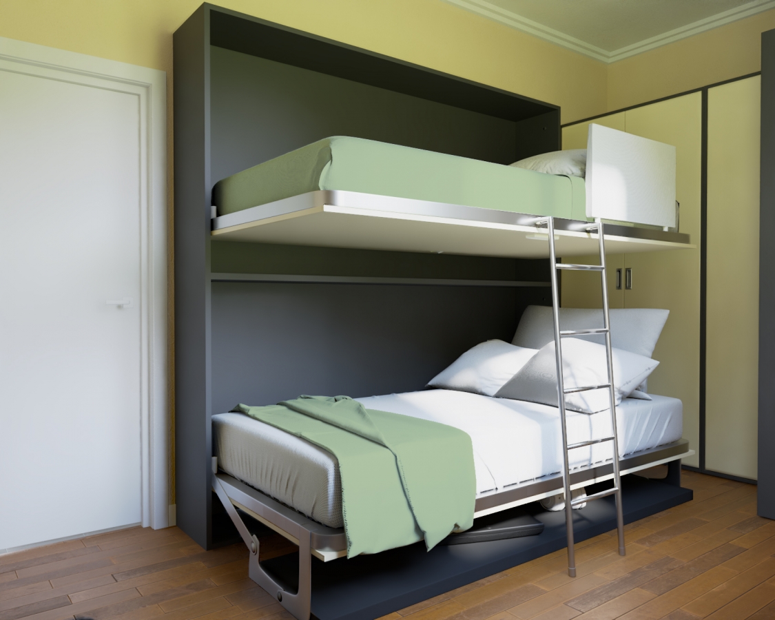 Camera da letto di circa 10 mq dove dormono 2 ragazzi che studiano, essa è stata arredata con un mobile letto a scomparsa a castello mod. Desk con una grande scrivania con apertura a lento rilascio sincronizzata con l’apertura del letto, quando il letto inferiore viene aperto per andare a dormire la scrivania si va a posizionare sotto il letto e scompare. Sulla parete di sinistra e quella difronte al letto è stata inserita una grande armadiatura attrezzata internamente per soddisfare le esigenze di entrambi i ragazzi. Entrando sulla parete di destra c’è invece una seconda scrivania necessaria a rendere autonomi e indipendenti nello studio i due ragazzi.