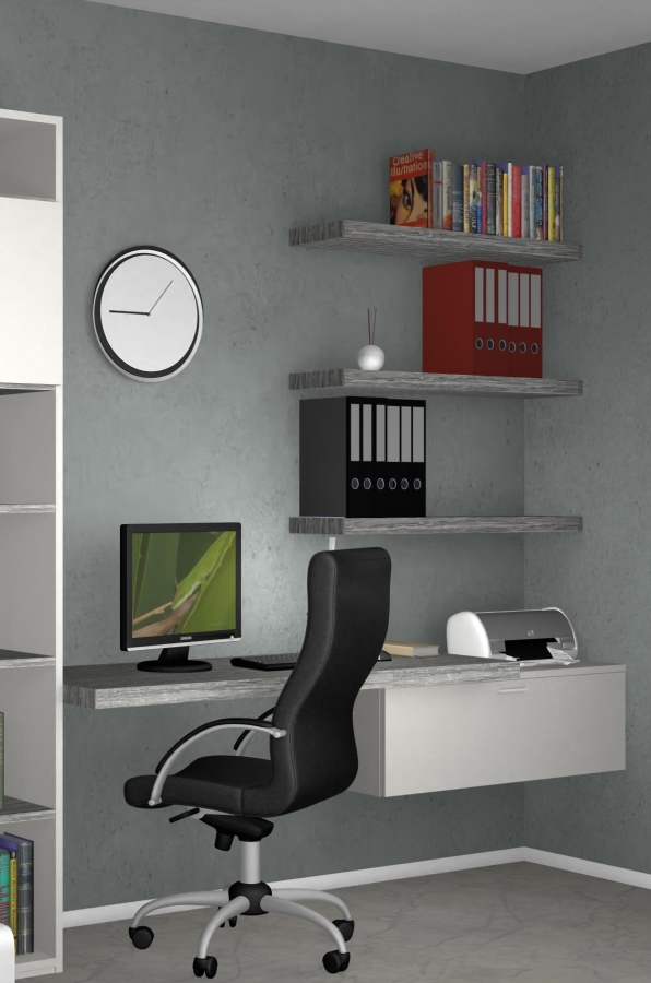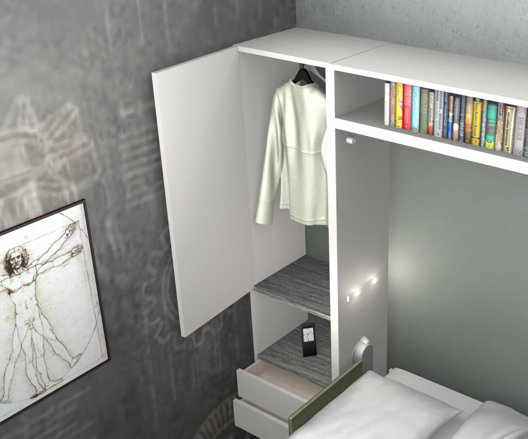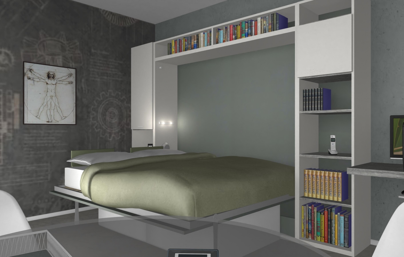 Mobile Letto a Scomparsa mod. Dolly Orizzontale 2 piazze con sopralzo e un divano contenitore tre comodi posti a sedere, ai lati ci sono 2 colonne libreria con ripiani a giorno e altri chiusi da ante battenti. Sul lato destro della stessa parete c’è un angolo studio arredato con: scrivania, mobile pensile, ripiani a giorno, computer e accessori vari.