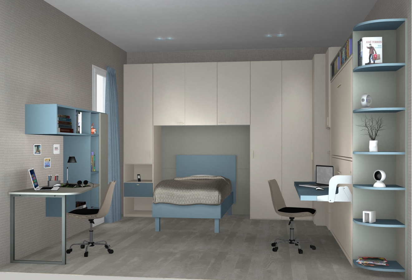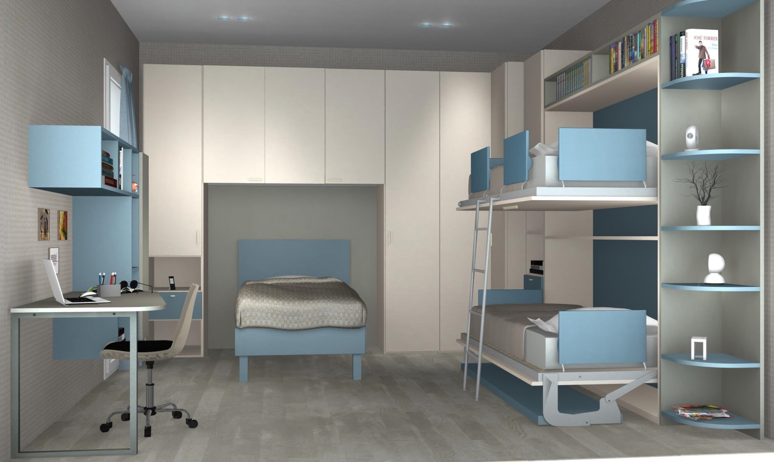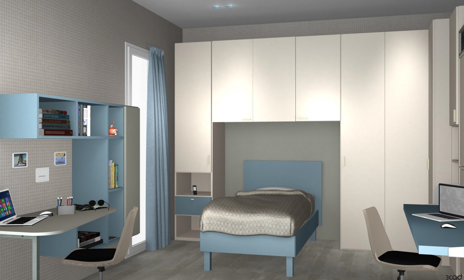 Camera da letto polifunzionale di 16,55 mq con 3 posti letto, questa risulta essere la soluzione ideale per 3 ragazzi che studiano e vivono nello stesso ambiente. L’arredamento di questa stanza è stato realizzato con 2 pareti attrezzate composte da un armadio a ponte con un letto di legno nella parte sottostante, un armadio ad angolo e un letto a castello a scomparsa mod. Desk con un sopralzo e ai lati 2 colonne libreria.