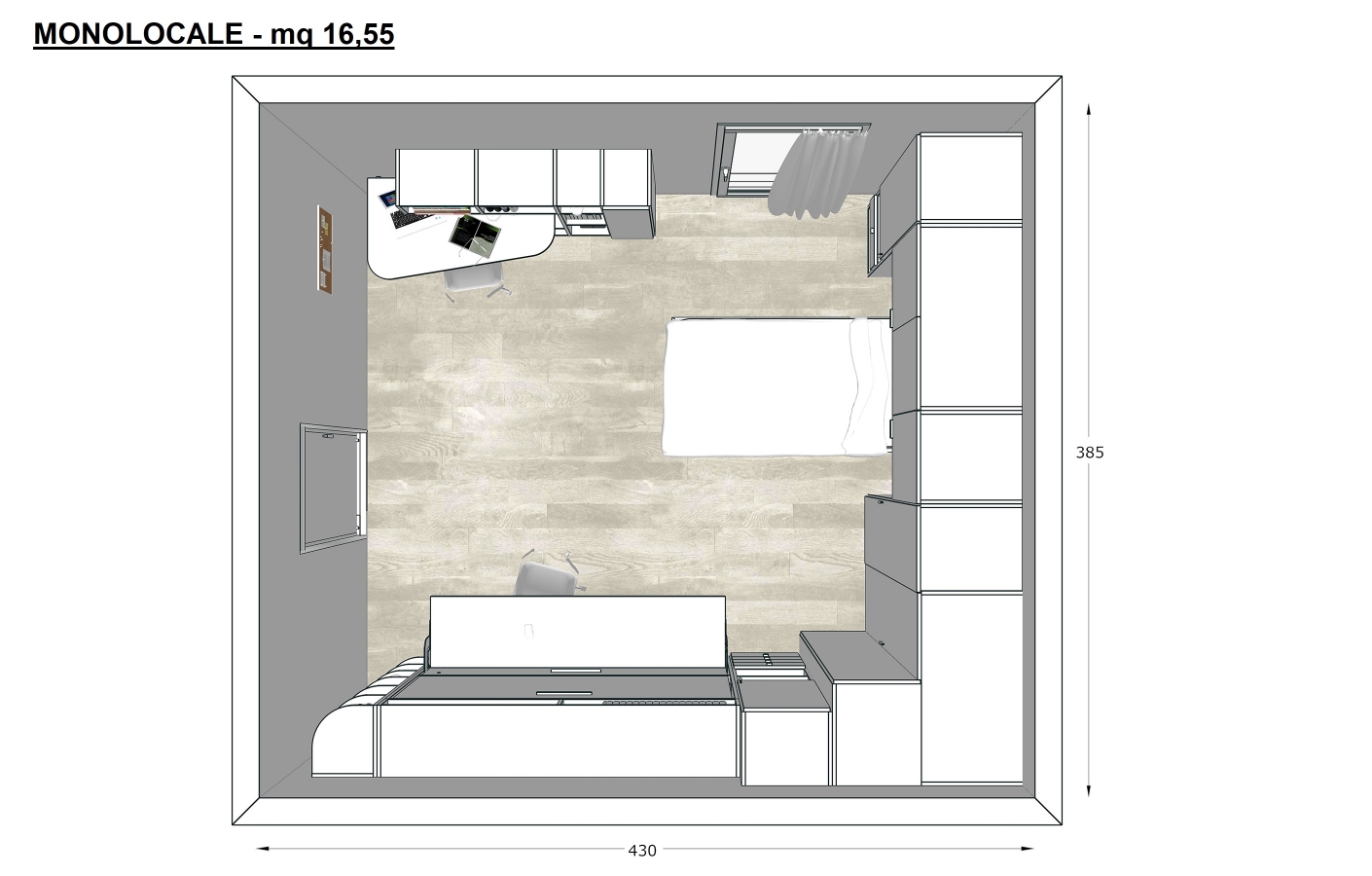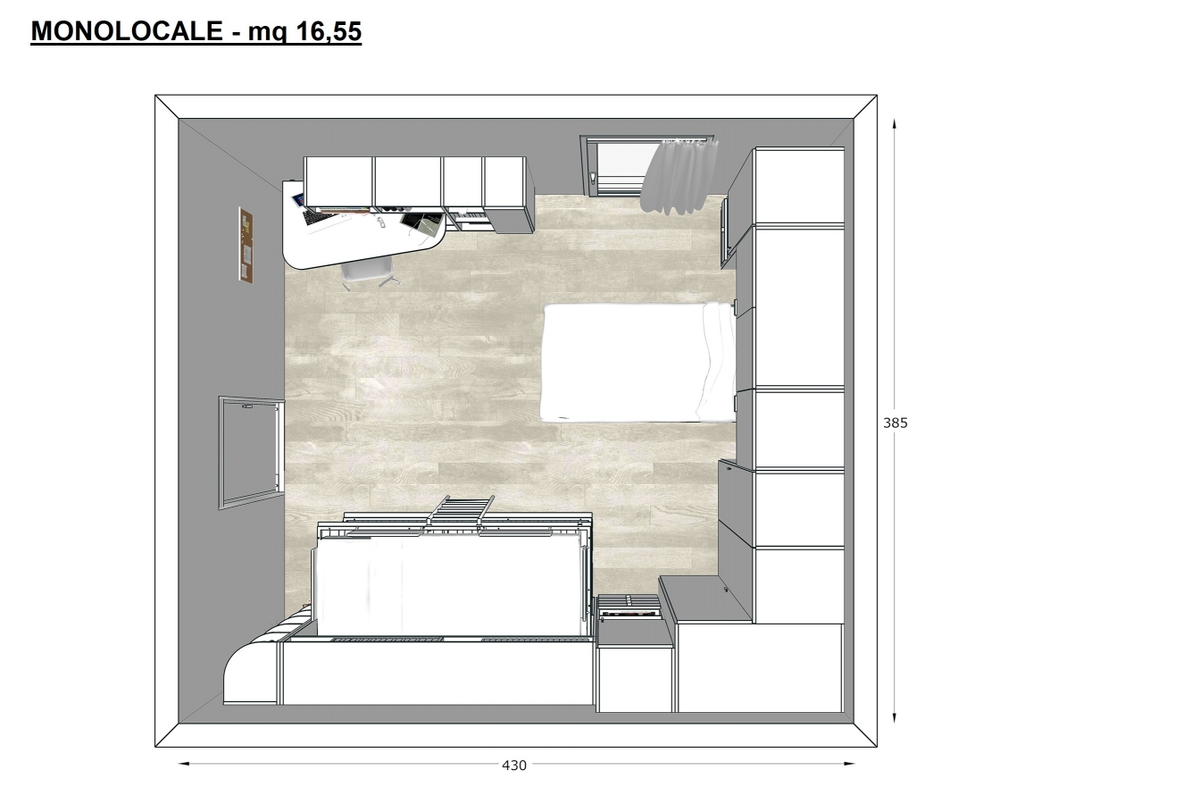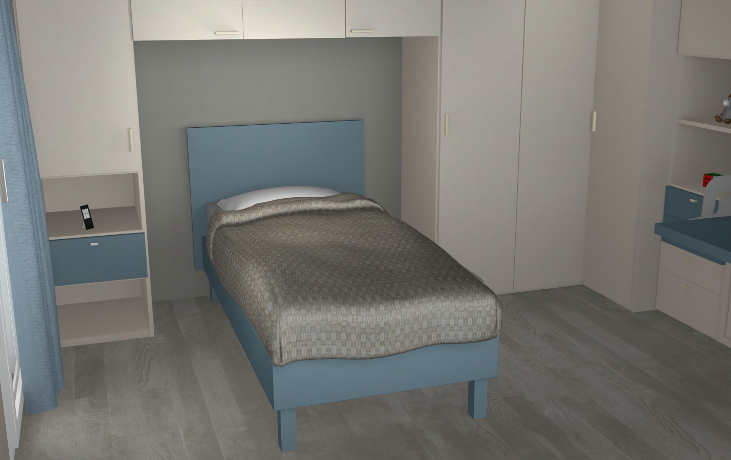 Camera da letto polifunzionale di 16,55 mq con 3 posti letto, questa risulta essere la soluzione ideale per 3 ragazzi che studiano e vivono nello stesso ambiente. L’arredamento di questa stanza è stato realizzato con 2 pareti attrezzate composte da un armadio a ponte con un letto di legno nella parte sottostante, un armadio ad angolo e un letto a castello a scomparsa mod. Desk con un sopralzo e ai lati 2 colonne libreria.