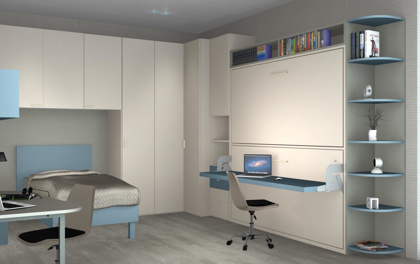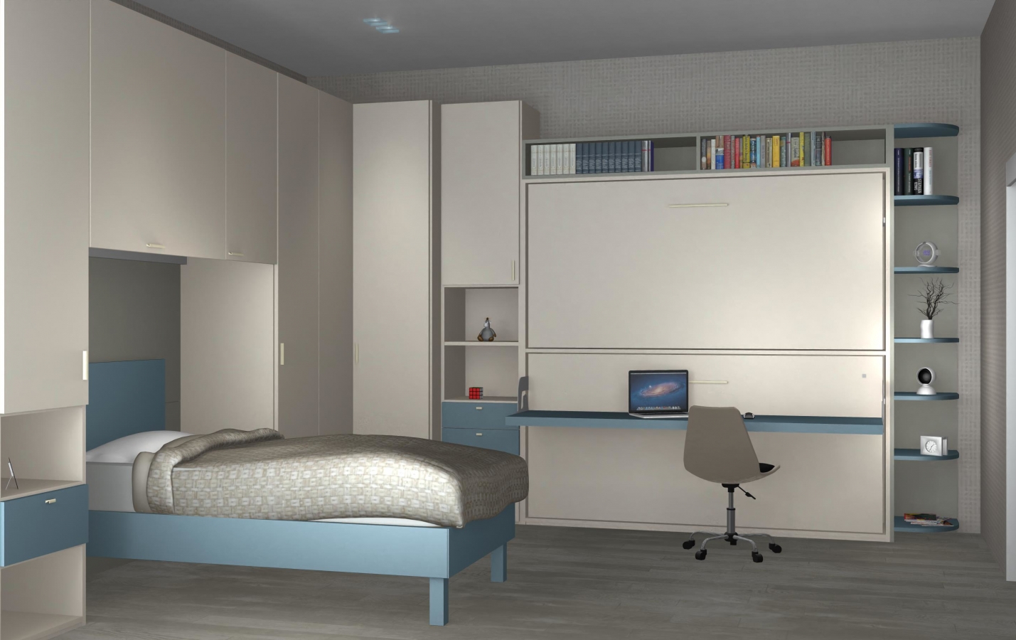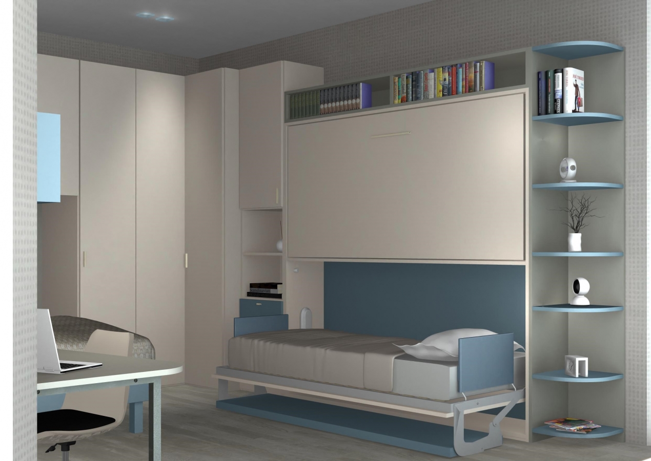 Mobile letto a scomparsa a castello mod. Desk con 2 comodi letti utilizzabili tutti e due insieme oppure separatamente. Il letto sottostante dispone di una grande scrivania L 210 x P 50 cm dove possono studiare contemporaneamente anche 2 ragazzi, quando il letto viene aperto la scrivania con un movimento sincronizzato a quello del letto inizia a muoversi fino a posizionarsi sotto il letto e scompare, nulla di quello che è posizionato sul piano scrivania deve essere rimosso. Nel lato sinistro del mobile letto c’è una colonna libreria con una cassettiera, due vani a giorno e un vano con ripiani chiuso da uno sportello. Nel lato destro invece c’è una libreria a giorno con ripiani stondati che addolcisce il fianco del mobile. Sulla parete accanto c’è una struttura con un armadio ad angolo che si collega all’armadio a ponte dove è posizionato un letto di legno bilaminato 1 piazza. A sinistra del ponte c’è una colonna armadio con un grande sportello nella parte superiore e 2 vani a giorno con in mezzo un comodo cassetto. Nella parete di sinistra vicino la porta finestra abbiamo una zona studio con scrivania, ripiani a giorno e altri chiusi con un’anta battente.