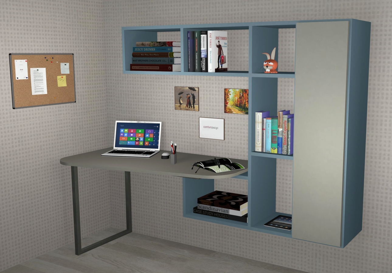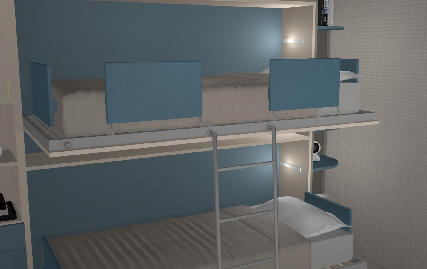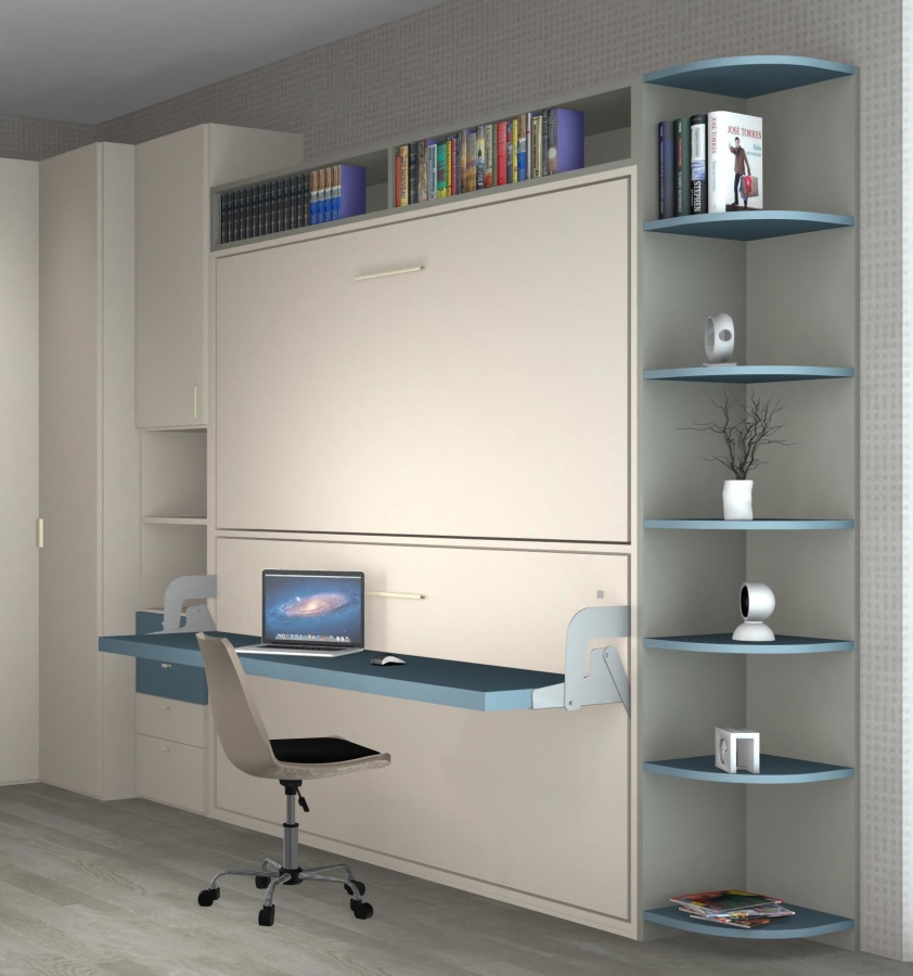 Mobile letto a scomparsa a castello mod. Desk con 2 comodi letti utilizzabili tutti e due insieme oppure separatamente. Il letto sottostante dispone di una grande scrivania L 210 x P 50 cm dove possono studiare contemporaneamente anche 2 ragazzi, quando il letto viene aperto la scrivania con un movimento sincronizzato a quello del letto inizia a muoversi fino a posizionarsi sotto il letto e scompare, nulla di quello che è posizionato sul piano scrivania deve essere rimosso. Nel lato sinistro del mobile letto c’è una colonna libreria con una cassettiera, due vani a giorno e un vano con ripiani chiuso da uno sportello. Nel lato destro invece c’è una libreria a giorno con ripiani stondati che addolcisce il fianco del mobile. Sulla parete accanto c’è una struttura con un armadio ad angolo che si collega all’armadio a ponte dove è posizionato un letto di legno bilaminato 1 piazza. A sinistra del ponte c’è una colonna armadio con un grande sportello nella parte superiore e 2 vani a giorno con in mezzo un comodo cassetto. Nella parete di sinistra vicino la porta finestra abbiamo una zona studio con scrivania, ripiani a giorno e altri chiusi con un’anta battente.