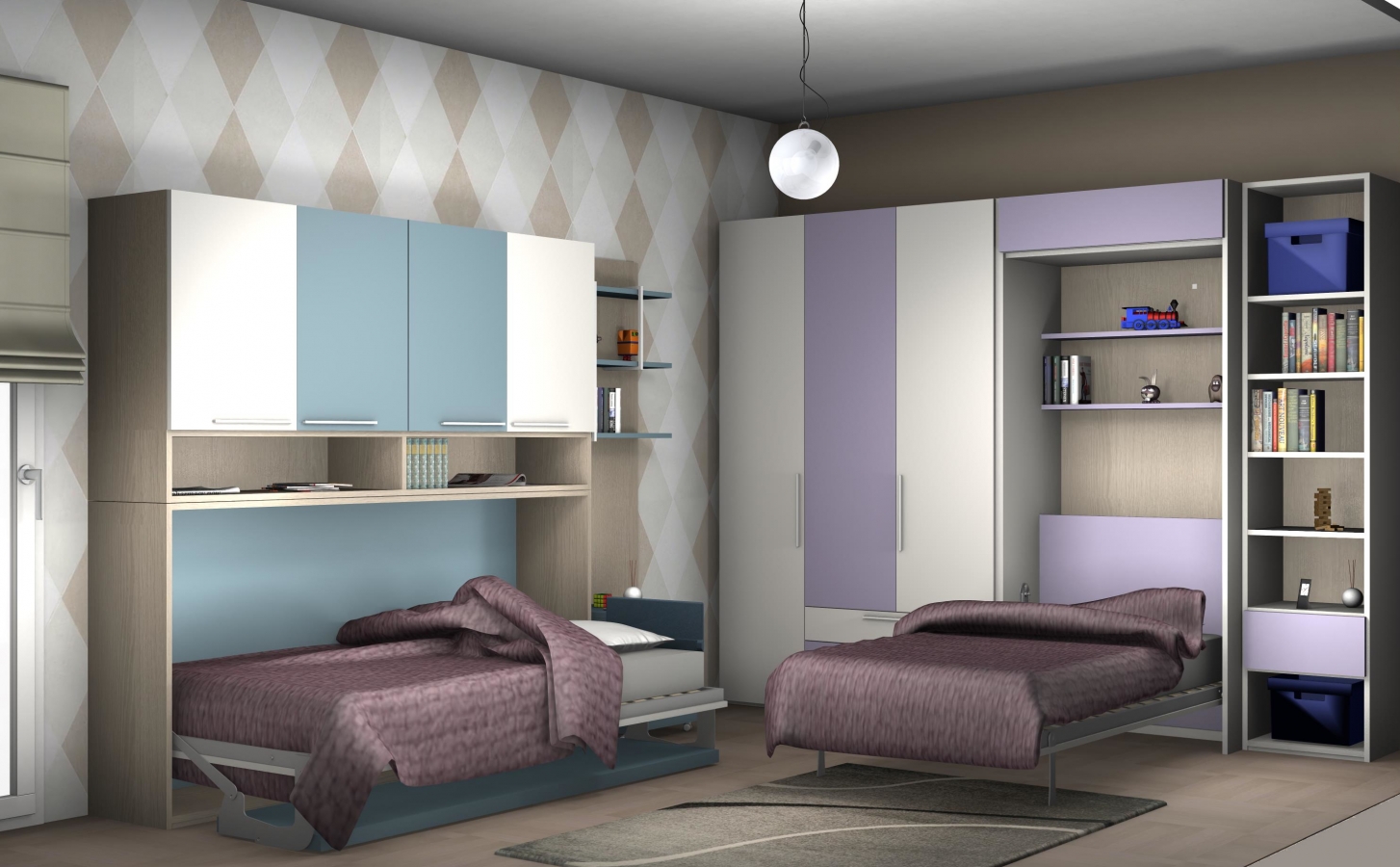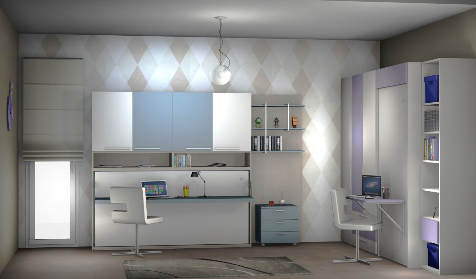 Camera da letto polifunzionale di 16 mq, essa ha la funzione di camera da letto e studio. Essa è stata arredata con pareti attrezzate composte da 2 mobili letto a scomparsa entrambi con scrivania incorporata e armadiature per soddisfare le esigenze di 2 ragazzi che studiano. Nelle foto che mostriamo si possono vedere anche i dettagli dei letti a scomparsa, delle librerie e delle armadiature.