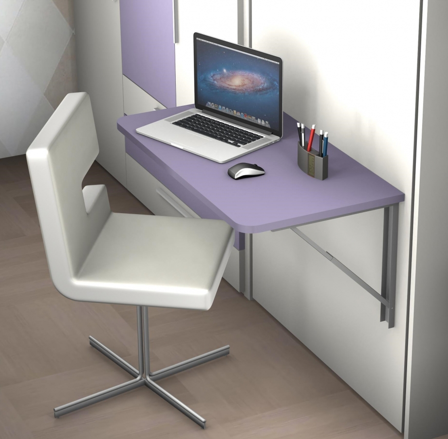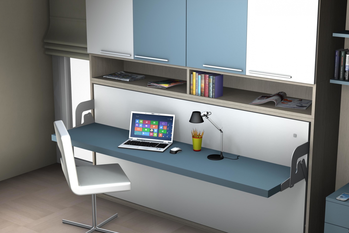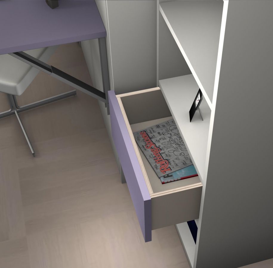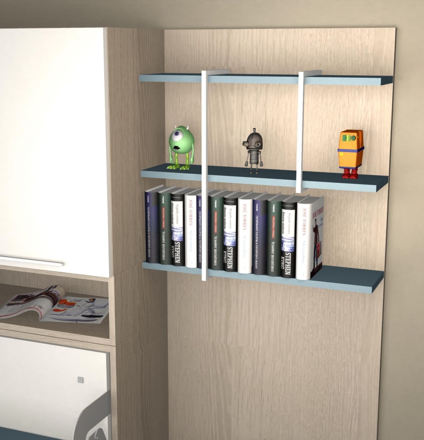 Mobile letto a scomparsa mod. Desk 1 piazza con apertura orizzontale composizione D. Esso dispone di una scrivania L 210 x P 50 cm, quando il letto viene aperto la scrivania con un movimento sincronizzato a quello del letto inizia a muoversi fino a posizionarsi sotto il letto e scompare, nulla di quello che è posizionato sul piano scrivania deve essere rimosso. La parte sovrastante il mobile letto è composta da 2 vani a giorno e 4 ante armadio. Sulla parete accanto è stata realizzata una parete attrezzata formata da un armadio 3 ante e 3 cassetti, sulla parte centrale un mobile letto a scomparsa con apertura verticale mod. Luna 1 piazza con uno scrittoio abbattibile. La particolarità di questo letto sta nel fatto che è profondo 60 cm, cioè ha la stessa profondità dell’armadio, ragione per cui sfruttando questa sua caratteristica sullo schienale abbiamo potuto realizzare un vano contenitore per metterci dentro cuscini per dormire e biancheria varia. Nella parte alta dello schienale invece abbiamo realizzato 2 ripiani per poggiare oggetti secondo necessità.