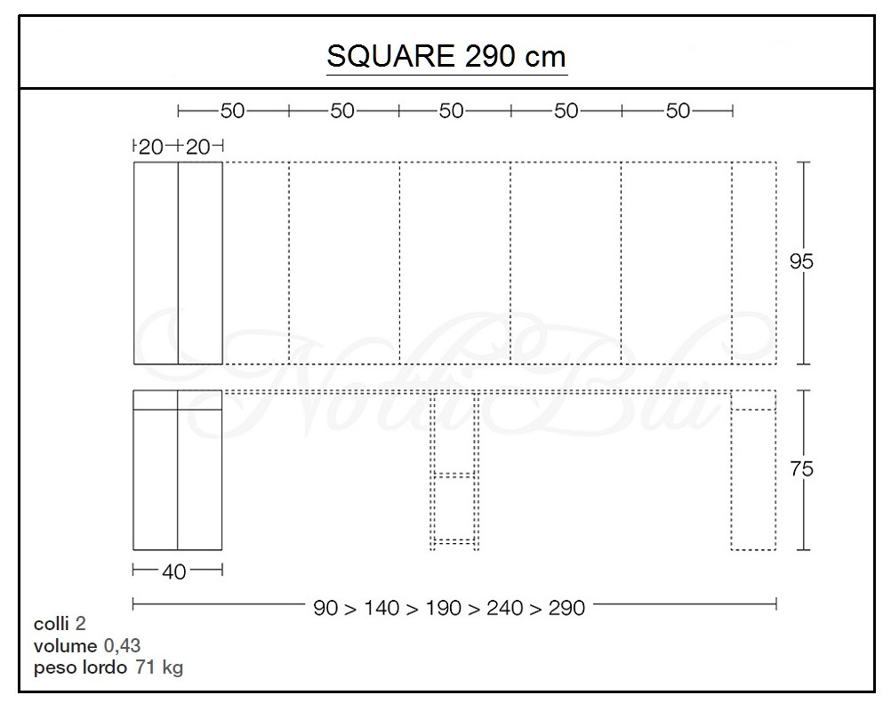 - Dimensioni aperta L 95 x P 290 x H 75 cm.