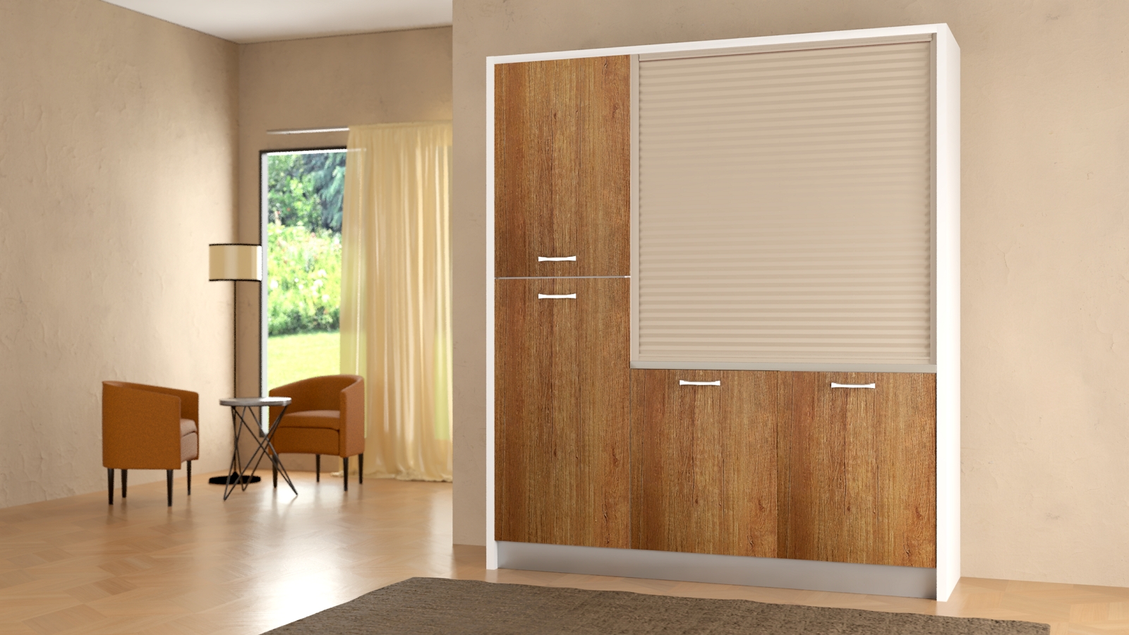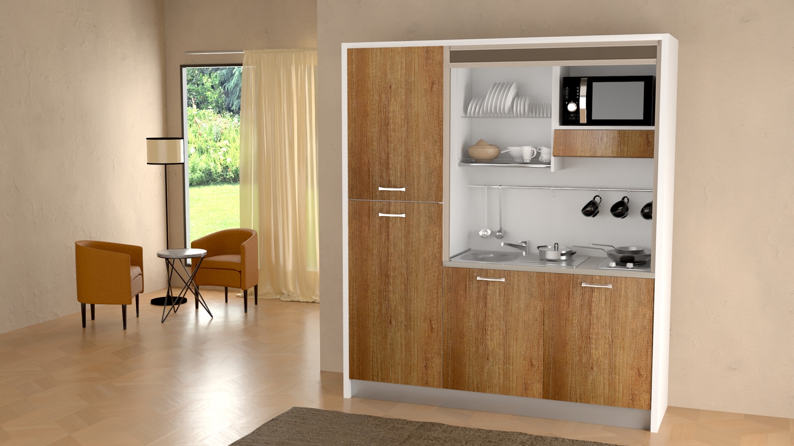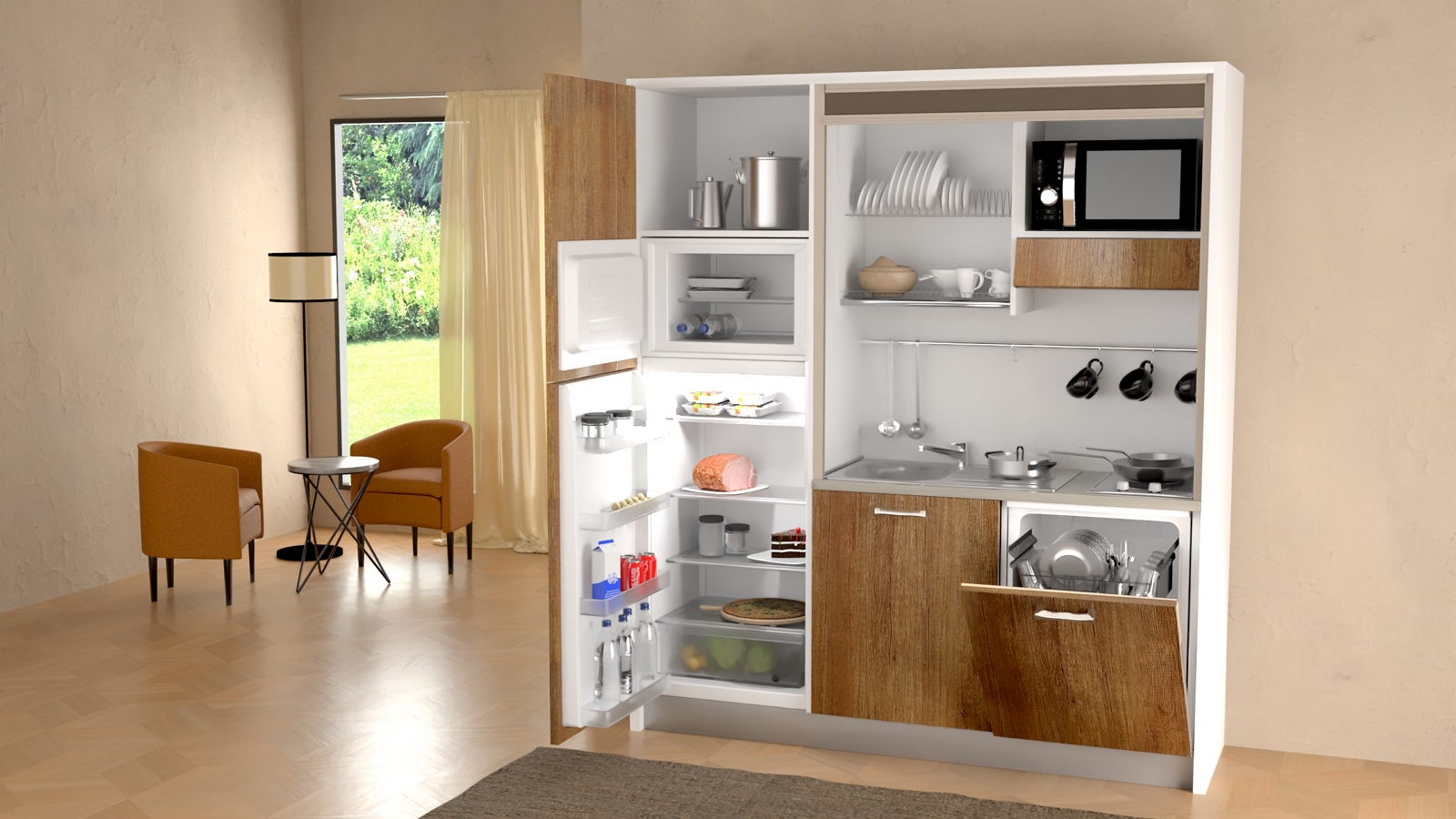La cucina monoblocco a scomparsa Clara pur avendo una larghezza di soli 187 cm può svolgere tutte le funzioni della tradizionale cucina, è allestita con elettrodomestici e scaffalature per lo stoccaggio dei cibi e di tutto ciò che ci necessita per non farci rimpiangere la tradizionale cucina. Tutto questo ci consente di cucinare con estrema facilità anche negli ambienti più piccoli, garantendoci la comodità di un pratico piano di lavoro e l’efficienza di elettrodomestici di assoluta qualità. Essa è composta da una colonna frigo con congelatore e un vano dispensa, un piano lavoro con 2 zone cottura e un lavandino inox con gocciolatoio, una lavastoviglie per 13 persone con 5 programmi, uno scolapiatti, una cappa aspirante con filtro a carboncini e un vano dove è possibile posizionare un forno combinato a microonde. La chiusura è costituita da una serrandina sali/scendi, con un piccolo gesto possiamo chiuderla e tutto scompare.