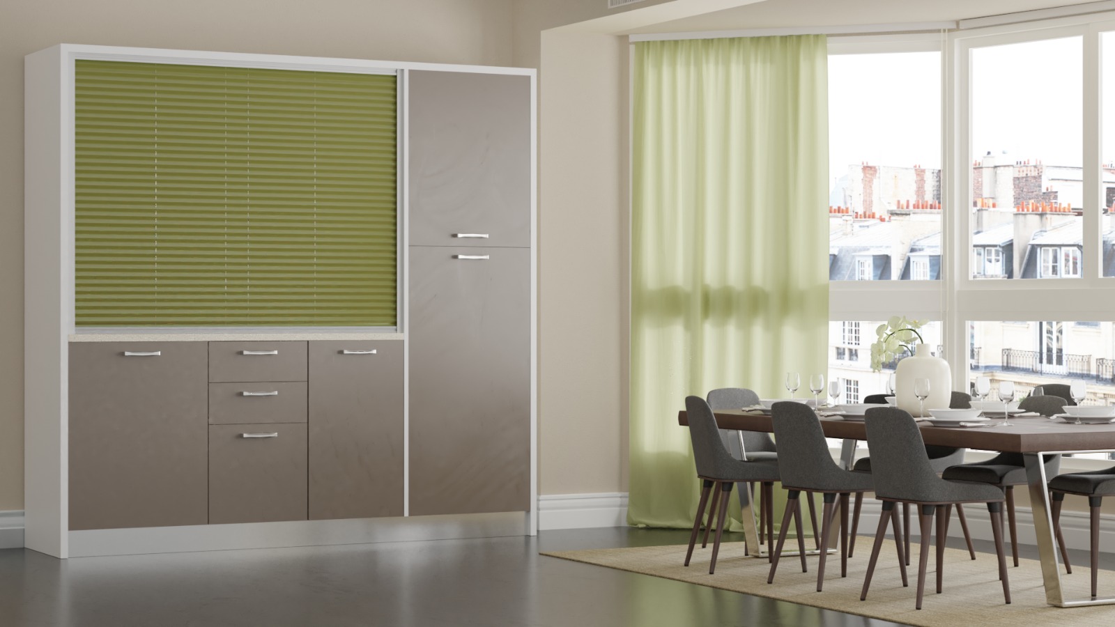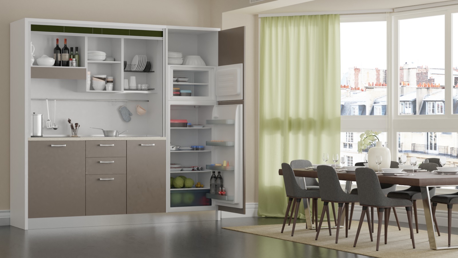 La cucina monoblocco a scomparsa Nora, rappresenta un'ottima soluzione per arredare monolocali e piccoli appartamenti, ma anche uffici, case al mare e in montagna, ambienti polifunzionali e tutti quei contesti in cui la cosa più importante è quella di risparmiare spazio consentendo di far scomparire la zona cucina a beneficio di un arredo funzionale.