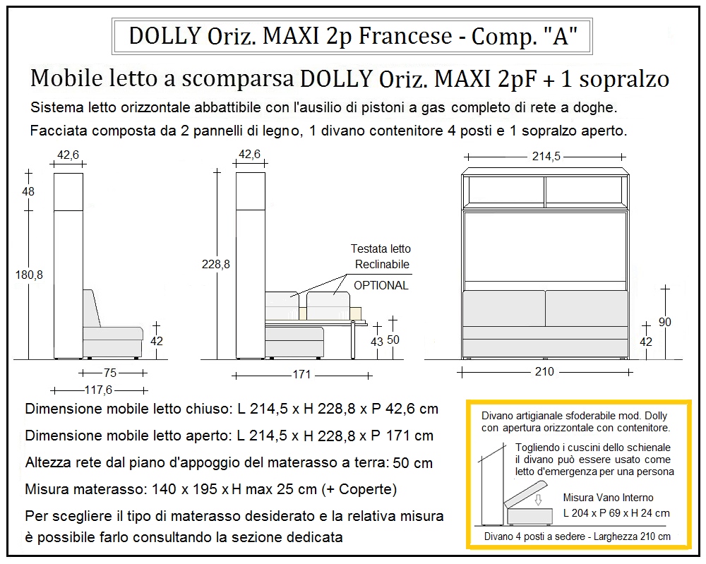 - Le dimensioni del mobile letto aperto sono: L 214,5 x P 171 x H 228,8 cm.