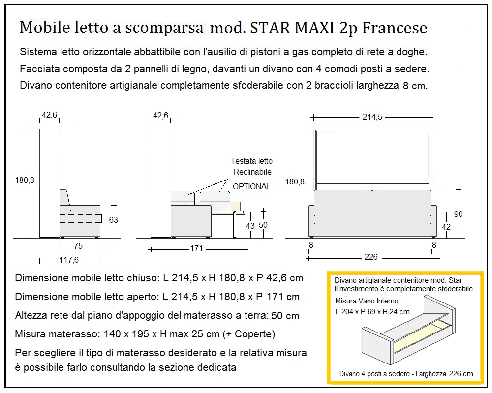 - Le dimensioni del mobile letto chiuso sono: L 214,5 x P 42,6 x H 180,8 cm.
