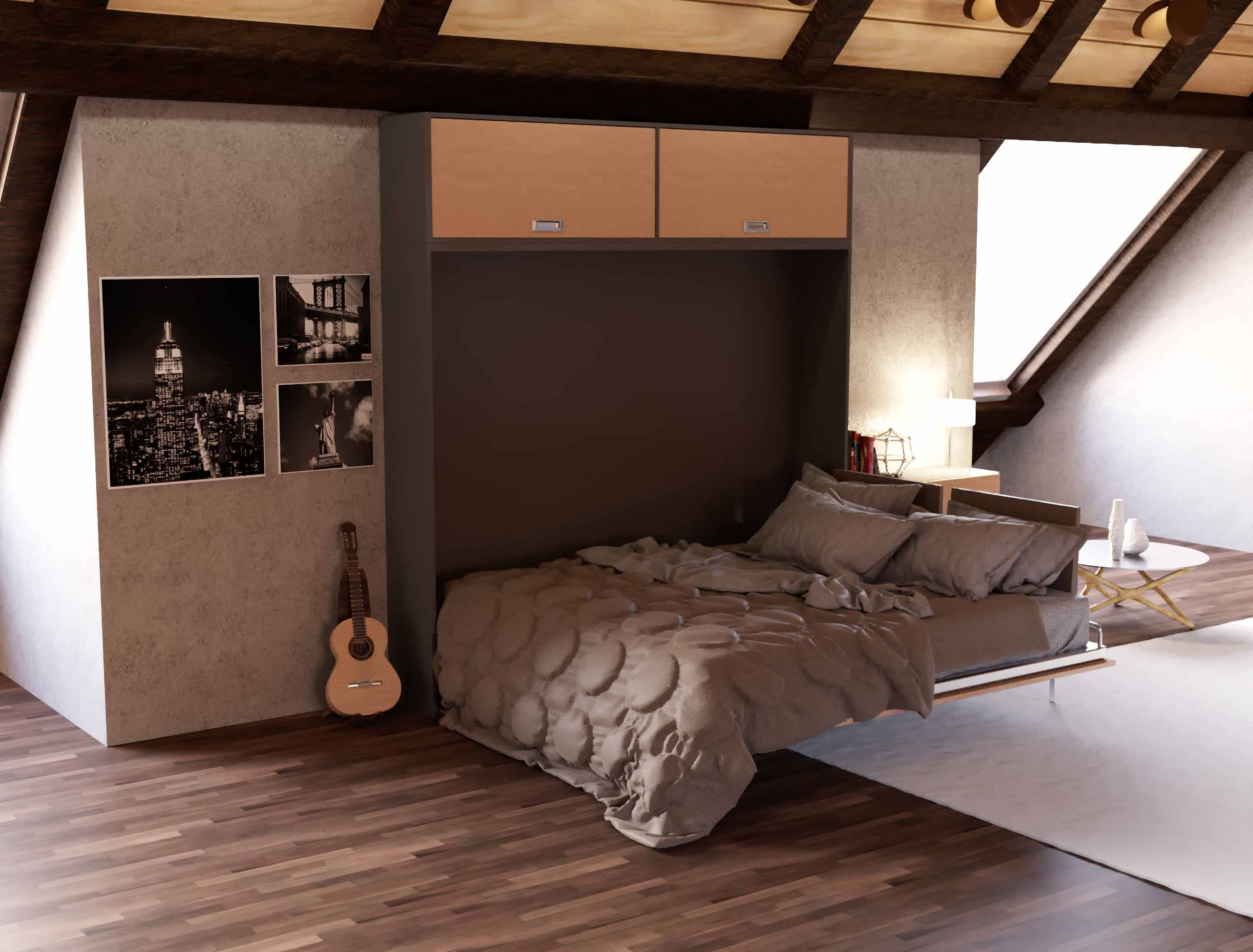 Modello Ugo Maxi 2 piazze francese - Composizione B 1. Mobile letto a scomparsa salvaspazio maxi 2 piazze francese con apertura orizzontale. 2. La facciata del mobile letto è composta da due pannelli di legno posti in orizzontale e un sopralzo con 2 vani chiusi con due sportelli a vasistas. 3. La struttura del mobile viene realizzata in legno cippato classe E1, rivestito con una lamina di legno Materico, Nobilitato, oppure con una lamina colorata in Ecolac con effetto cera, disponibile in diverse varianti di colore. Questo tipo di legno oggi trova facile applicazione perchè è un prodotto robusto, affidabile ed è a garanzia dell’ambiente in quanto esente da vernici e solventi. 4. Il mobile letto a scomparsa mod. Ugo Maxi 2 piazze francese - Composizione B dispone di un programma di componibilità che comprende elementi strutturali di profondità maggiorata. Tale programma ci consente di realizzare pareti attrezzate di dimensioni e forma idonee a soddisfare ogni nostra esigenza di spazio di cui: colonne libreria, colonne armadio, sopralzi, ecc. 5. Il mobile letto mod. Ugo Maxi 2 piazze francese - Composizione B viene prodotto 100% in Italia e distribuito in tutta Europa dalla Notti Blu. 6. Le dimensioni del mobile letto chiuso sono: L 214,5 x P 42,6 x H 210,3 cm. 7. Le dimensioni del mobile letto aperto sono: L 214,5 x P 171 x H 210,3 cm. 8. Le dimensioni della rete sono: L 150 x 205 cm. 9. La struttura della rete è costituita da un telaio di ferro verniciata al forno con polveri epossidiche atossiche come da normativa di legge. La base d’appoggio del materasso è a doghe di faggio stagionato con rinforzi al centro delle due piazze per consentirne l’uso unitamente a un materasso adeguato anche a persone che pesano oltre 120 kg, le cosidette “TAGLIE FORTI”. 10. Il movimento del letto è dato da uno speciale sistema d’apertura e chiusura servoassistito da pistoni a gas che garantisce estrema sicurezza ed elevata affidabilità. Quando il letto viene aperto il suo movimento è a “LENTO RILASCIO” vale a dire che si apre molto lentamente fino a raggiungere la posizione orizzontale di un normale letto. Quando invece dobbiamo chiuderlo è sufficiente la forza di un bambino per fare si che esso si solleva e si va a posizionare dentro il mobile letto e scompare. 11. La rete è corredata di cinghie elastiche ferma materasso necessarie a mantenere in ordine il riassetto quotidiano del letto anche quando questo viene chiuso, in questo modo possiamo disporre di un letto sempre pronto per andare a dormire. 12. Le dimensione del materasso sono L 140 x 195 x H max 25 cm + coperte. (Optional) 13. Per la scelta del materasso consultare la guida: MATERASSI CONSIGLIATI 14. A questo mobile letto a scomparsa è possibile inserire due plafoniere con luci led molto utili soprattutto per chi ha la necessità di alzarsi dal letto durante la notte (Optional). 15. Viene fornito completamente smontato per essere trasportato in qualsiasi luogo (mansarde, piani alti, seminterrati, ecc.). 16. E’ obbligatorio il fissaggio al muro. 17. Garanzia: La ditta Notti Blu garantisce questo prodotto per 2 anni. 18. Gli elementi: Libreria, Armadiature, Sopralzi, Accessori, Materasso, Testata reclinabile, Luci Led, ecc. sono “Optional” 19. Il prezzo si riferisce al solo mobile letto a scomparsa, sono esclusi tutti gli elementi opzionali. 20. Dove è previsto vengono indicate anche le misure e il prezzo dell’intera composizione.