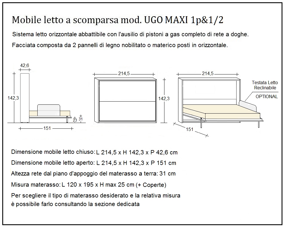 - Le dimensioni del mobile letto chiuso sono: L 214,5 x P 42,6 x H 142,3 cm.