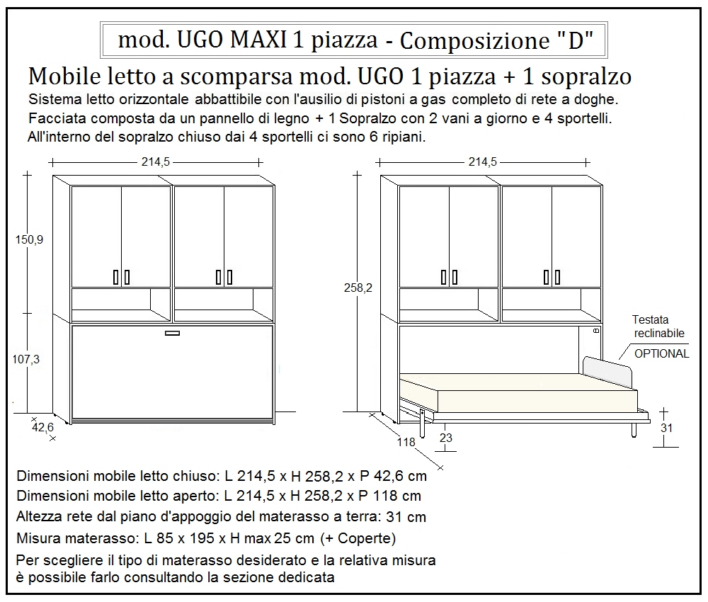 - Il mobile letto a scomparsa mod. Ugo Maxi 1 piazza - Composizione D dispone di un programma di componibilità che comprende elementi strutturali profondi 42,6 cm. Tale programma ci consente di realizzare pareti attrezzate di dimensioni e forma idonee a soddisfare ogni nostra esigenza di spazio di cui: colonne libreria, colonne armadio, sopralzi, ecc.