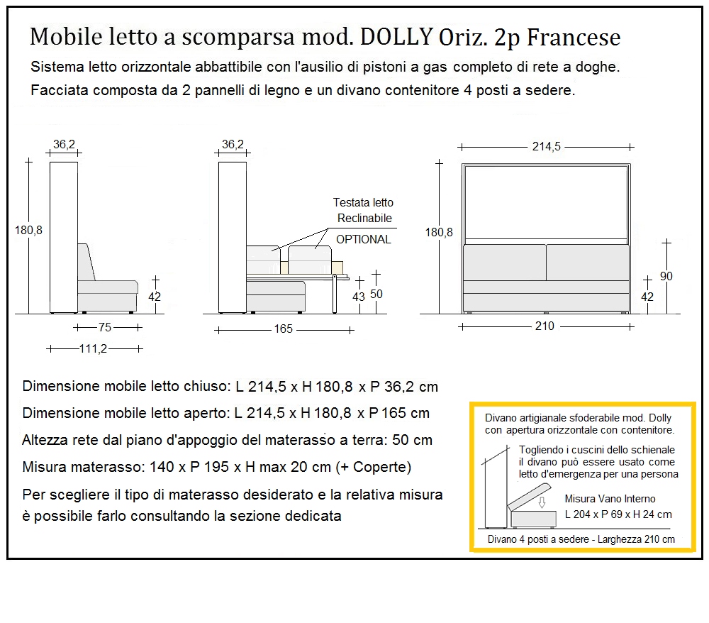 - Le dimensioni del mobile letto aperto sono: L 214,5 x P 165 x H 180,8 cm.