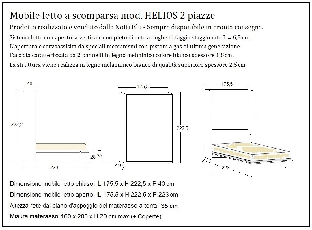 Il mobile letto a scomparsa mod. Elios 2 piazze viene prodotto e distribuito in tutta Europa dalla Notti Blu.