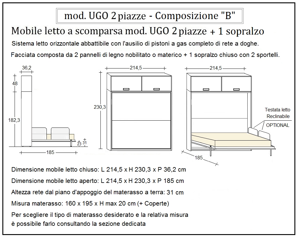 - Il mobile letto a scomparsa mod. Ugo 2 piazze - Composizione B dispone di un programma di componibilità che comprende elementi strutturali profondi 36,2 cm. Tale programma ci consente di realizzare pareti attrezzate di dimensioni e forma idonee a soddisfare ogni nostra esigenza di spazio di cui: colonne libreria, colonne armadio, sopralzi, ecc.