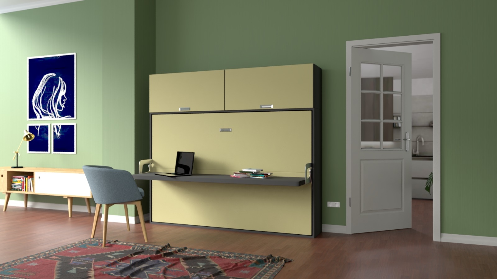 Modello Desk 1 piazza e 1/2 - Composizione B 1. Mobile letto a scomparsa salvaspazio 1 piazza e 1/2 con apertura orizzontale. 2. La facciata del mobile letto è composta da due pannelli di legno posti in orizzontale e un sopralzo chiuso con due sportelli a vasistas. Davanti la facciata c’è una scrivania L 206 x P 50 x H 5 cm con movimento sincronizzato con quello del letto. Quando apriamo il letto per andare a dormire, man mano che il letto si apre la scrivania mantenendo sempre una posizione orizzontale si sposta e si va a nascondere sotto il letto, nulla di quello è poggiano sul piano scrivania va rimosso. 3. La struttura del mobile viene realizzata in legno cippato classe E1 rivestito con una lamina di legno Materico, Nobilitato, oppure con una lamina colorata in Ecolac con effetto cera, disponibile in diverse varianti di colore. Questo tipo di legno oggi trova facile applicazione perchè è un prodotto robusto, affidabile ed è a garanzia dell’ambiente in quanto esente da vernici e solventi. 4. Il mobile letto a scomparsa mod. Desk 1 piazza e 1/2 – Composizione B dispone di un programma di componibilità che comprende elementi strutturali profondi 36,2 cm. Tale programma ci consente di realizzare pareti attrezzate di dimensioni e forma idonee a soddisfare ogni nostra esigenza di spazio di cui: colonne libreria, colonne armadio, sopralzi, ecc. 5. Il mobile letto mod. Desk 1 piazza e 1/2 – Composizione B viene prodotto 100% in Italia e distribuito in tutta Europa dalla Notti Blu. 6. Le dimensioni del mobile letto chiuso sono: L 214,5 x P 36,2 x H 190,3 cm. 7. Le dimensioni del mobile letto aperto sono: L 214,5 x P 145 x H 190,3 cm. 8. Le dimensioni della rete sono: L 125 x 207cm. 9. La struttura della rete è costituita da un telaio in ferro verniciato al forno con polveri epossidiche atossiche come da normativa di legge. La base d’appoggio del materasso è a doghe di faggio stagionato con rinforzi al centro per consentire l’uso del letto anche a persone che pesano oltre 100 kg. 10. La rete è corredata di cinghie elastiche ferma materasso necessarie a mantenere in ordine il riassetto quotidiano del letto anche quando questo viene chiuso, in modo possiamo disporre di un letto sempre pronto per andare a dormire. 11. Le dimensione del materasso sono L 120 x 195 x H max 20 cm (Optional) 12. Per la scelta del materasso consultare la guida: MATERASSI CONSIGLIATI 13. Il movimento del letto è dato da uno speciale sistema d’apertura e chiusura servoassistito da pistoni a gas che garantisce estrema sicurezza ed elevata affidabilità. 14. A questo mobile letto a scomparsa è possibile inserire plafoniere con luci led molto utili soprattutto per chi ha la necessità di alzarsi dal letto durante la notte (Optional). 15. Viene fornito completamente smontato per essere trasportato in qualsiasi luogo (mansarde, piani alti, seminterrati, ecc.). 16. E’ obbligatorio il fissaggio al muro. 17. Garanzia: La ditta Notti Blu garantisce questo prodotto per 2 anni. 18. Gli elementi: Libreria, Armadiature, Sopralzi, Accessori, Materasso, Testata reclinabile, Luci Led, ecc. sono “Optional” 19. Il prezzo si riferisce al solo mobile letto a scomparsa, sono esclusi tutti gli elementi opzionali. 20. Dove è previsto vengono indicate anche le misure e il prezzo dell’intera composizione.