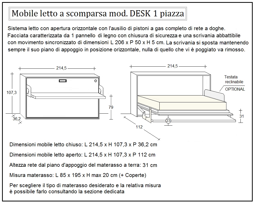 - Le dimensioni del mobile letto chiuso sono: L 214,5 x P 36,2 x H 107,5 cm.