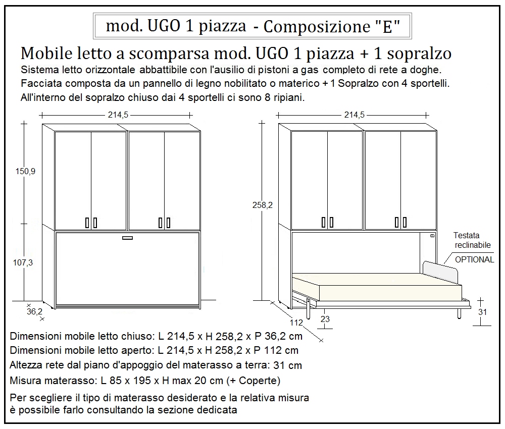 - Le dimensioni del mobile letto chiuso sono: L 214,5 x P 36,2 x H 258,2 cm.