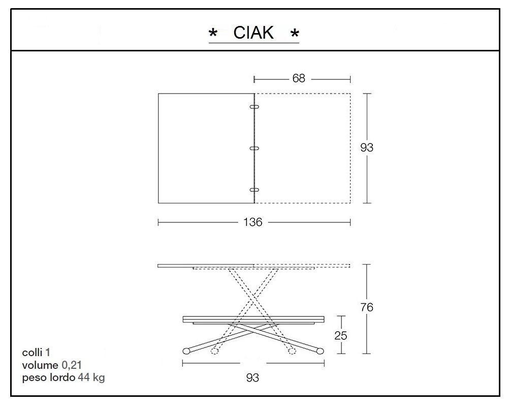 Ciak è un tavolino da salotto trasformabile in tavolo pranzo di dimensione molto contenute 93 x 68 cm. Ha un’apertura a libro e in sole due mosse raddoppia la sua lunghezza assumendo le dimensioni di 93 x 136 cm. Ha un sistema di sollevamento servoassistito da pistoni a gas che va da 25 a 76 cm, regolabile in altezza al millimetro. La base può essere realizzata in metallo verniciato o anodizzato. Il piano del tavolo è disponibile in legno nobilitato in diverse varianti. Il tavolino Ciak è ciò che ci vuole quando naturalezza e semplicità sono i valori in cui crediamo e che desideriamo esprimere attraverso l’arredamento della nostra casa.