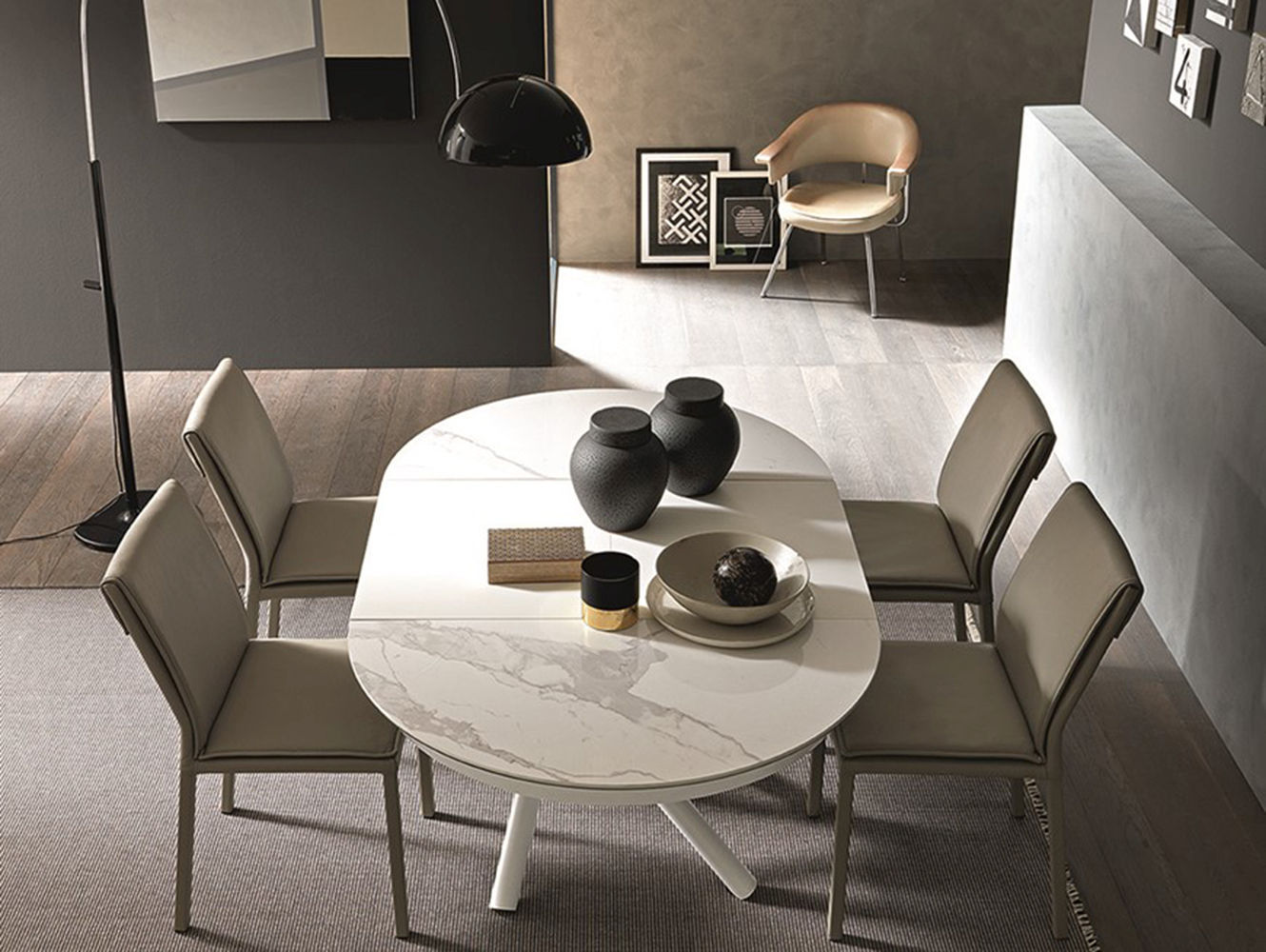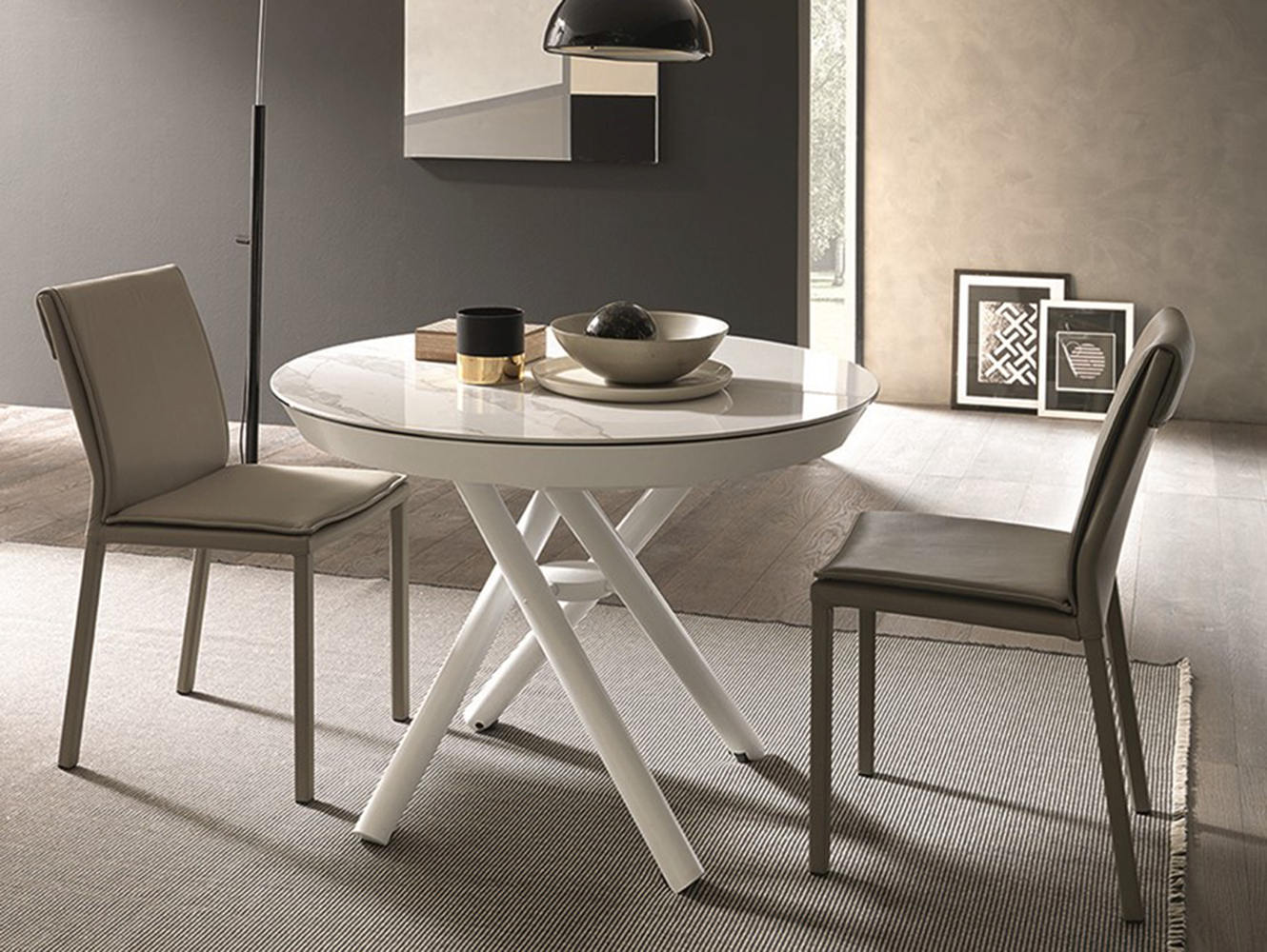 Helios è un tavolino dal piano circolare estremamente versatile nelle funzioni e nell’estetica. Il meccanismo è stato opportunamente studiato per potersi trasformare da un seducente tavolino da salotto in un tavolo da pranzo, allungandosi offre estremo confort a chi lo utilizza. La struttura sottostante in metallo si incrocia in un piacevole e suggestivo gioco di linee. Helios ha una base in metallo e un meccanismo a gas. L’altezza è regolabile al millimetro da cm 36 a cm 75, il piano è rotondo disponibile in legno nobilitato in diverse varianti. Esso ha un diametro di 105 cm, grazie a una prolunga interna che si apre a libro si trasforma in un tavolo da pranzo di forma ovale di dimensioni 105 x 165 cm. Dispone di 4 ruote a scomparsa per essere spostato in qualsiasi punto della stanza.